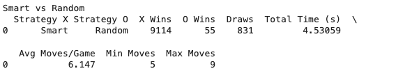 - Random vs Random is fastest at 0.9 seconds while Smart vs Smart takes 10.32 seconds — makes sense since the smart strategy has to evaluate conditions each move
