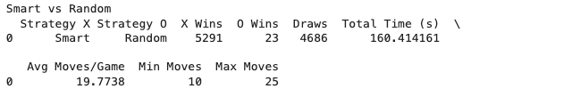 - In Smart vs Random, the random strategy O still wins a small number of games